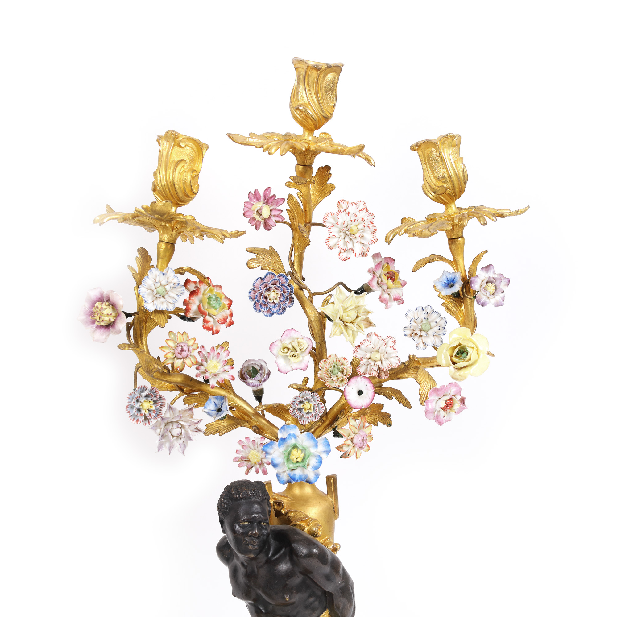 139. Pereche de sfeșnice Blackamoor cu câte trei lumini, decorată cu flori din porțelan pictat, design după Charles Cordier [A doua jumătate a sec. XX]