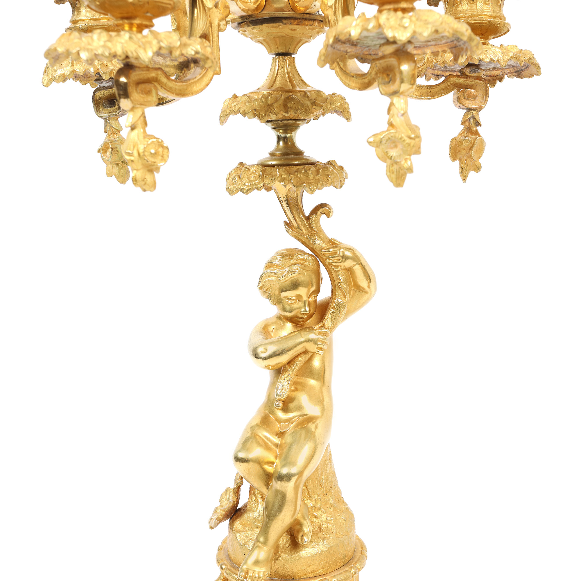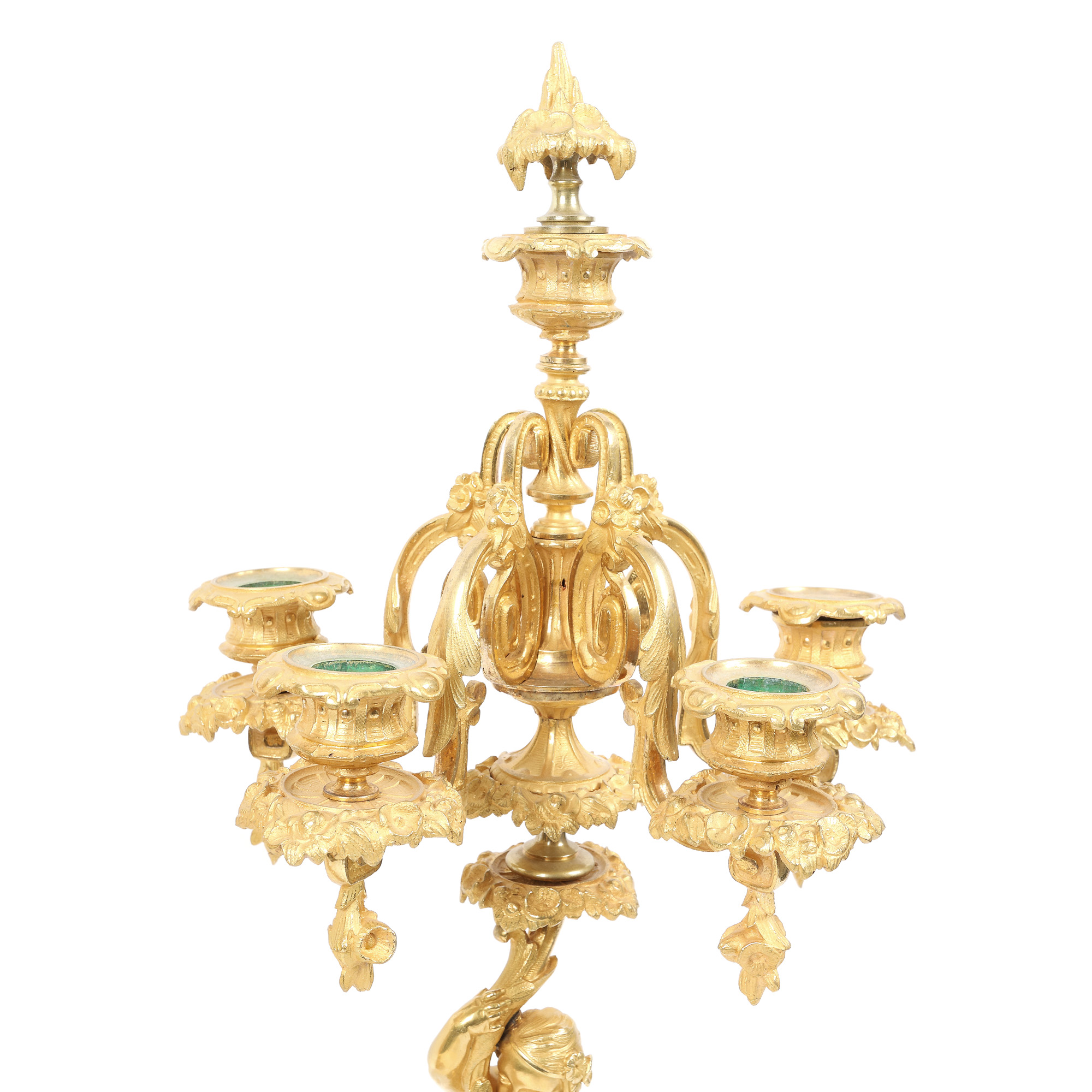 137. Pereche de sfeșnice din bronz aurit în manieră Louis XVI, cu câte cinci lumini, bogat decorată cu motive vegetale, sec. XIX
