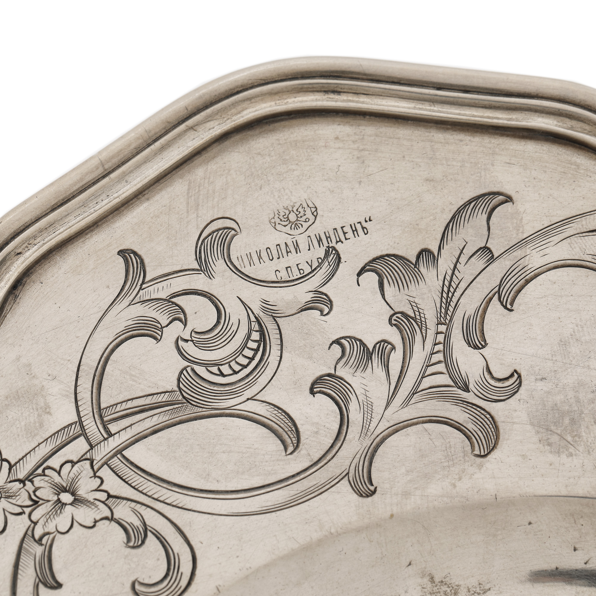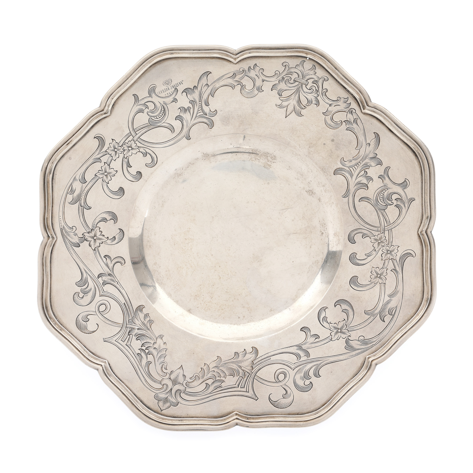 169. Platou din argint rusesc, gravat cu motive vegetale și marcat cu poanson-ul magazinului Nikolai Linden din Saint Petersburg, cca. 1908-1926