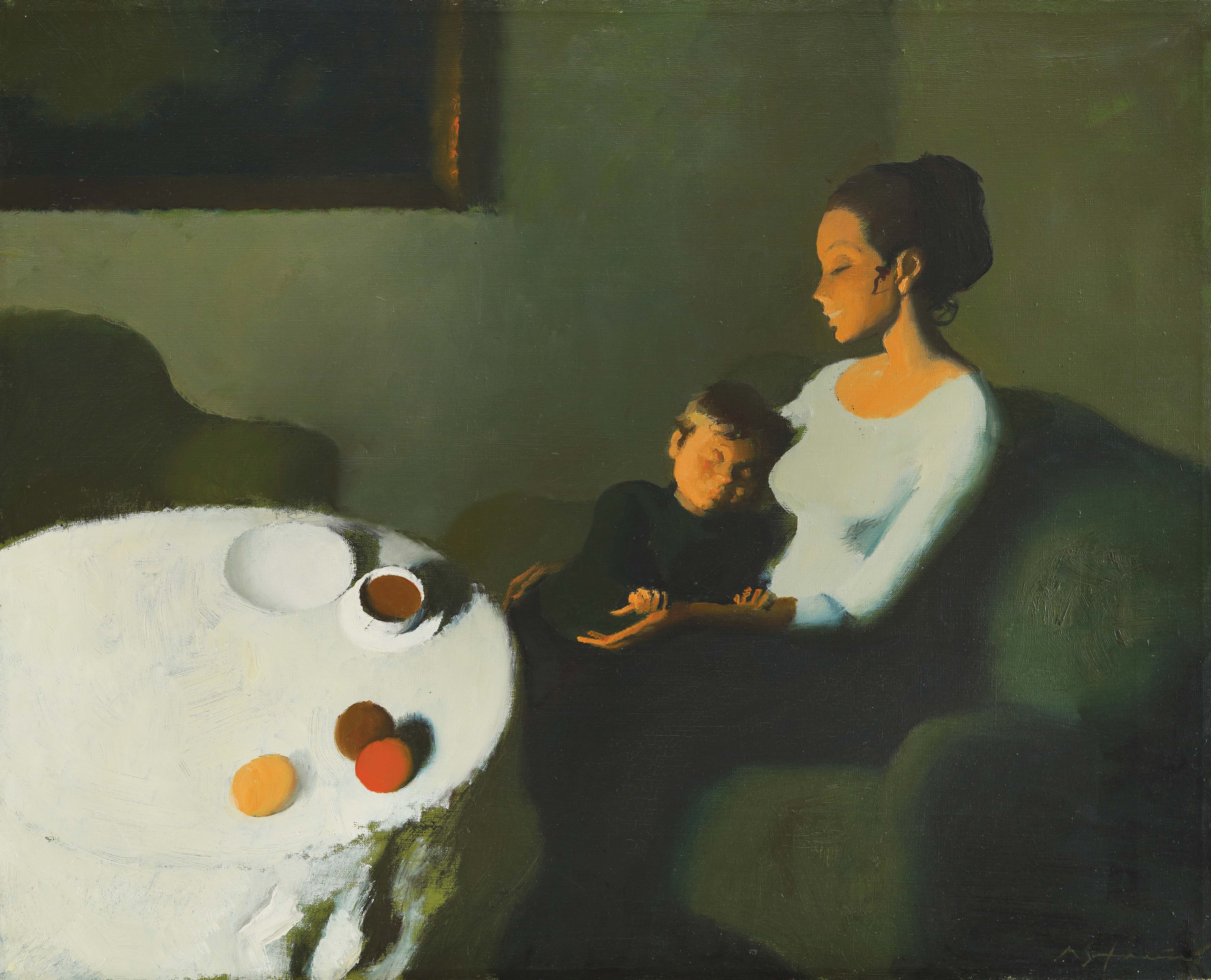 Miljenko Stančić (Varaždin, 1926. – Zagreb, 1977.) hrvatski je slikar i grafičar. Rodio se u teškim uvjetima. Otac mu je nekoliko godina radio u SAD-u, sudjelovao u Prvom svjetskom ratu kao vojnik te u Varaždinu radio kao željezničar. Tri godine prije rođenja Miljenka Stančića rodio se njegov brat Slavko koji je preminuo sa samo šest mjeseci. Smrt starijeg brata kojeg nikad nije upoznao ispoljavat će u mnogim Stančićevim djelima. Slikao je i crtao već kao dijete, ali je tijekom Drugoga svjetskog rata bomba pala na njegovu kuću u Varaždinu i uništila njegova rana djela. Diplomirao je na Akademiji likovnih umjetnosti u Zagrebu 1949. godine te pohađao tečaj grafike kod Tomislava Krizmana iduće dvije godine. Bez roditeljskog znanja oženio je Melitu Abramović s kojom je imao jednog sina. Izrađivao je ilustracije za novine, knjige i časopise te zidne slike na stropu HNK u Varaždinu. Njegova su djela bila izložena u Zagrebu, Beogradu, Varaždinu, Parizu, Bruxellesu. Od 1961. godine do prerane smrti u 51. godini predaje na Akademiji. Preminuo je u Zagrebu te je pokopan u svome rodnome Varaždinu. Stančić se smatra začetnikom hrvatskoga poslijeratnog nadrealnog i fantastičnog slikarstva. U njegovim su se radovima ispreplitali san i java, autobiografski i imaginarni događaji. Stančićevi najraniji radovi datiraju u njegove tinejdžerske godine kad je na pakpapiru iz majčina ormara nacrtao Zagorski cug na kojem se odmah primjećuje njegov neosporni crtački talent. Tijekom stvaranja pratio je tehniku starih majstora (Vermeer, Georges de la Tour). U prvome razdoblju slika rodni Varaždin – njegove ulice, trgove, interijere. Na slikama se prikazuje stvarnost isprepletana sa snovima. Česti motivi su postavljen stol, bijeli stolnjak, kuhinja i prazna spavaća soba. Od 1954. godine slika metamorfoze ljudskih likova, a njegova žena Melita nadahnula je ciklus slika pod nazivom Ljubavnici. Dominantan motiv njegovih slika tijekom cijeloga života jest dijete. Prikazivao je lebdeća dječja tijela, kartaše, ženske likove u profilu, mrtvace, muškarca i ženu u ljubavnom zanosu. Prostorna jednostavnost njegovih kompozicija može se objasniti time da je slikao po sjećanju. U 50-ima je hiperproducirao djela, što po narudžbi, što po vlastitoj inspiraciji te ga je kritika napadala da mu djela gube na vrijednosti i da pretjerano koristi isti motive. U tim godinama izlagao je s Vaništom u Muzeju za umjetnost i obrt, te su im se kasnije pridružili i Ljubo Ivančić, Valerije Michieli i Ivan Kožarić koji su zajedno činili Grupu petorice. Ulje na platnu nastalo 1970. godine prikazuje tipičnu stančićevsku komornu scenu – tamnu atmosferu, majku prikazanu iz profila i sina oko postavljenoga stola koji može simbolizirati zajedništvo, tj. mjesto okupljanja. Na stolu se nalazi uobičajeni bijeli stolnjak, prazni bijeli tanjur, šalica kave te tri okrugla smeđa predmeta – tri peciva ili tri dječje igračke. Lik majke sjedi na tamnosivome naslonjaču, a sin joj leži na krilu. Njihovi likovi podsjećaju na lutke, zatvorenih očiju djeluju hipnotizirano. Simbol materinstva vjerojatno je Stančić preuzeo od francuskog simbolista Eugenea Carrièra. Carrièr je često prikazivao majke s djecom u nježnim i intimnim trenucima iz kojih izbija osjećaj njihova dubokog emocionalnog povezivanja. Također je koristio svjetlost i sjenu kako bi dobio na mističnosti. Stančićeva slika djeluje umirujuće – svijetloplava majčina majica iskače u odnosu na sivu pozadinu i sive naslonjače, kao da iz majčina torza dolazi svjetlo koje rasvjetljuje cijelu kompoziciju.