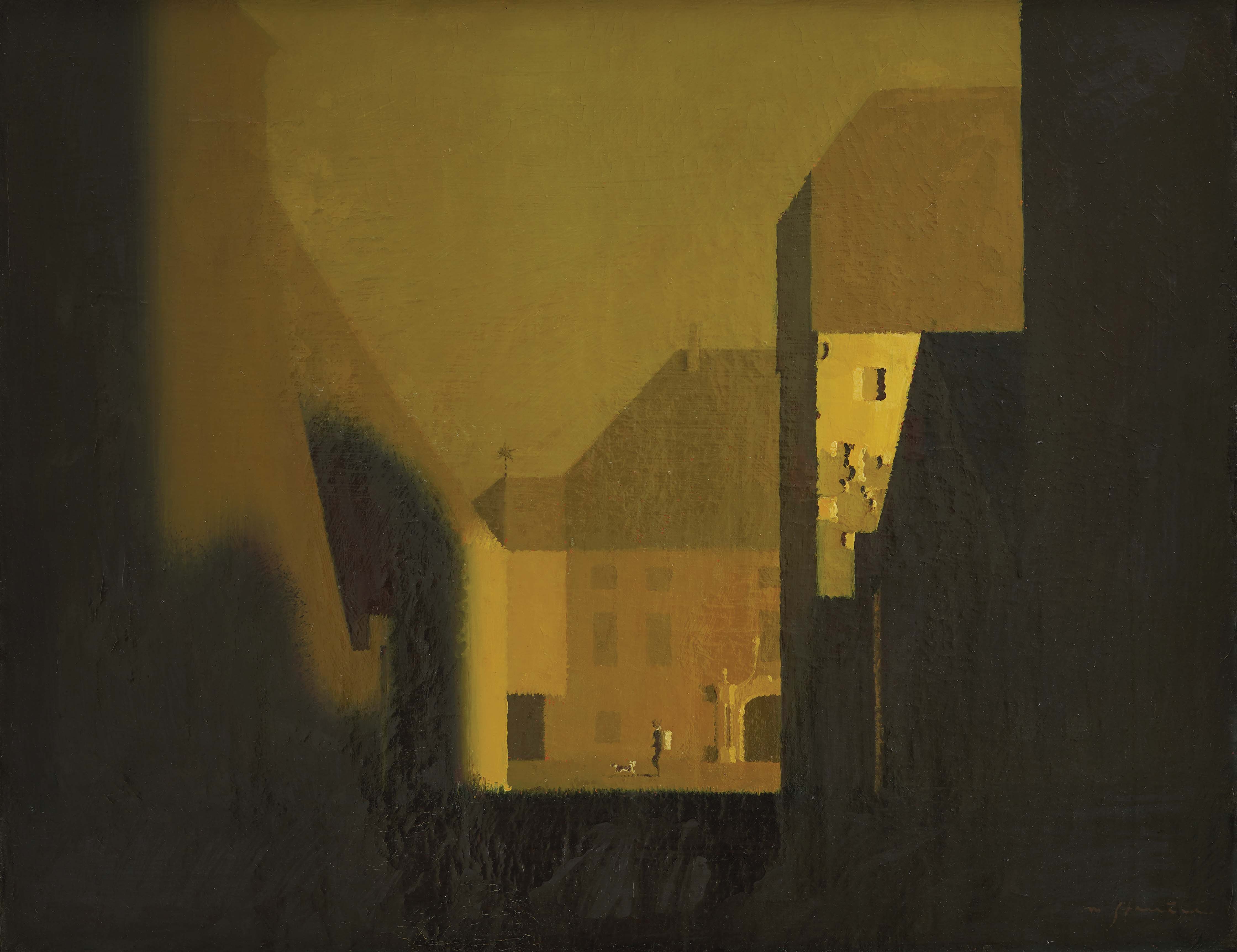 Varaždinski slikar Miljenko Stančić (Varaždin, 1926. - Zagreb, 1977.) jedan je od ključnih predstavnika slikarstva nadrealističkih i metafizičkih tendencija u Hrvatskoj. Rođen je kao drugo dijete roditelja Valentina i Marije, sedam godina nakon što im prvi sin umire s tek šest mjeseci. Rana spoznaja o preranoj smrti brata ostavila je jak utisak na slikara, što je primjetno u čestim motivima smrti u njegovom slikarstvu. Nakon završene gimnazije u Varaždinu, slikar odlazi u Zagreb i upisuje Akademiju likovnih umjetnosti te završava postdiplomski studij grafike 1949. godine u klasi Tomislava Krizmana. Već tri godine kasnije prvi put izlaže svoja djela sa slikarom Josipom Vaništa, a 1955. godine kao član “Grupe petorice” predstavlja svoje slike u Muzeju za umjetnost i obrt. Početkom šezdesetih godina izabran je za docenta na Akademiji likovnih umjetnosti u Zagrebu, a ubrzo objavljuje i knjigu reprodukcija svojih djela u vlastitoj nakladi s predgovorom Miroslava Krleže. U ovom razdoblju gradi kuću i atelje na Braču, međutim morski ambijent nema naročit utisak na njegovo slikarstvo - on čak i na Braču i dalje slika varaždinske motive. Moderna galerija JAZU mu 1970. godine priređuje retrospektivnu izložbu, osvrćući se na dva desetljeća njegova opusa. Osim slikarstvom, bavio se grafikom, scenografijom i ilustracijom za novine i časopise. Njegov se stilski izričaj, pod utjecajem europskog nadrealizma, metafizičkog slikarstva i psihoanalize prve polovine 20. stoljeća od samih početaka razvija kao svojstvena slikarska perspektiva, gdje su stvarni, intimni, autobiografski i izmišljeni elementi spojeni na neobičan način, stvarajući mističan ugođaj. U njegovom je stvaralaštvu trajno prisutna snovita atmosfera koju postiže rekompozicijom motiva iz stvarnog života, dodajući suptilne efekte fantastičnog, metafizičkog i nadrealnog. Početkom svoje karijere bio je duboko pod utjecajem starih majstora kao što su Vermeer i Georges de la Tour te se njegovi rani radovi, stoga, odlikuju preciznošću i pažljivim toniranjem, deskripcijom detalja i baroknim svjetlosnim efektima. U prizorima gradskih eksterijera prikazuje opustjele ulice, trgove i siluete baroknih crkava, koristeći suptilno svjetlo sutona kako bi stvorio osjećaj nostalgije. Sredinom svoje karijere, varaždinski slikar počinje eksperimentirati s fantastičnim transformacijama ljudskih likova. Trajni motiv njegova stvaralaštva, međutim, ostaju smirene, nepokretne figure lutkastih fizionomija smještene u interijere obasjane neobičnim svjetlosnim efektima. Nakon 1970. godine, Stančić u svoja djela počinje unositi i erotske motive. Ovdje predstavljena slika pripada njegovom ciklusu pustih varaždinskih veduta i krajolika, ponavljajućem motivu u njegovom opusu. Na slici je prikazan pogled na varaždinski Franjevački trg s lijeva i desna uokviren zasjenjenim fasadama. Kasnopopodnevna zelenkasta svjetlost s desna obasjava pročelje palače Patačić, sa svojim prepoznatljivim baroknim portalom - jedinim detaljem koji ovaj snoviti prizor vezuje uz realno mjesto. Prisustvo tek jedne anonimne figure u prolazu nagovješta prazninu koja će ubrzo uslijediti, čime slikar postiže još snažniji efekt usamljenosti i melankolije nego li potpuno praznim prostorom. Između 1963. i 1968. godine Stančić slika gotovo istovjetne varaždinske vedute s pogledom na palaču Patačić, uz tek nekoliko manjih varijacija u detaljima. Iz tog je razloga moguće ovu sliku okvirno datirati u to petogodišnje razdoblje.