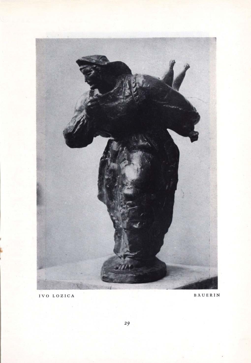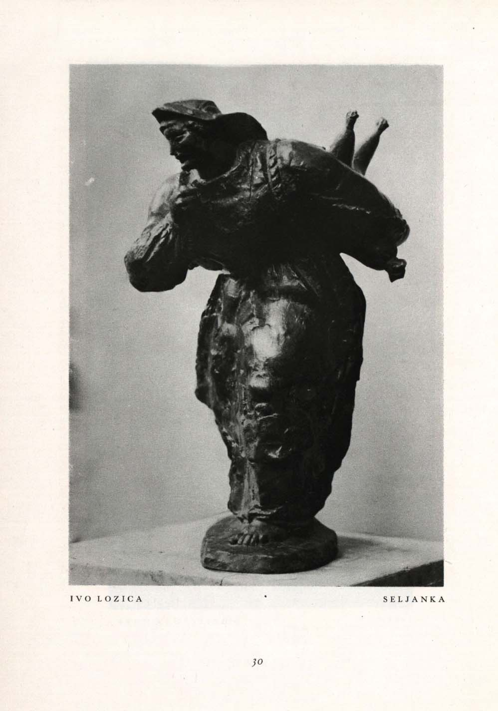 Kipar Ivo Lozica (Lumbarda, 1910. - 1943.) u vrlo kratkom vremenu pod mentorstvom Frane Kršinića i utjecajem francuskih kipara Aristidea Maillola i Augustea Rodina - s čijim se djelom upoznaje za vrijeme studija na École des Beaux-Arts u Parizu - ostvaruje jedinstveni opus u različitim kiparskim materijalima. Lozica je, poput Kršinića, svoj kiparski izraz pronašao u lirskom oblikovanju ženskih aktova i dinamično pokrenutih, snažnih skulptura titrave površine. Jedna je takva i skulptura Seljanka, čije su verzije više puta izlagane na domaćim i stranim izložbama. Njezina prva verzija nastaje par godina prije kipareve prerane smrti, kada se sve više okreće socijalnoj tematici i motivima ruralnog dalmatinskog života.