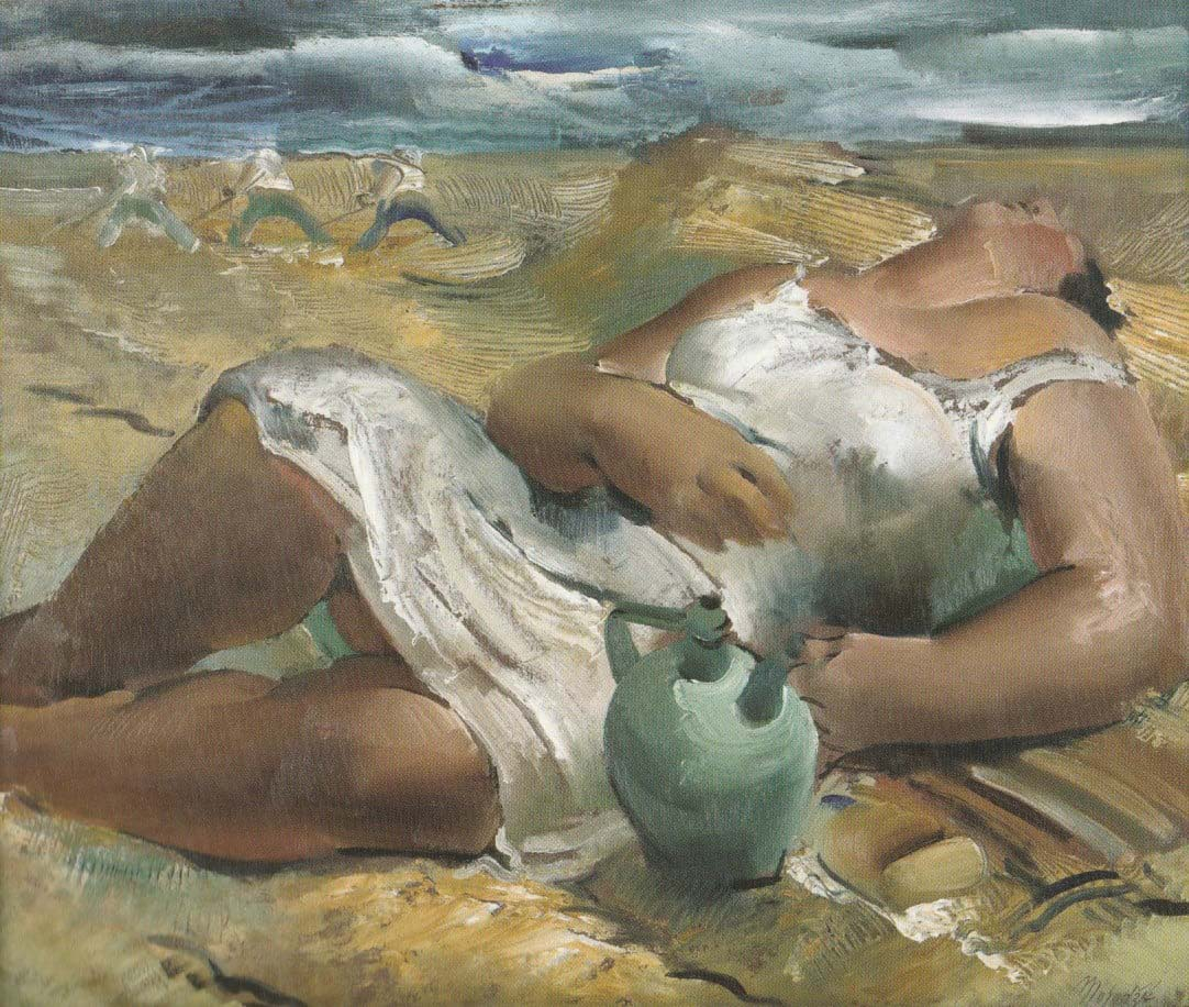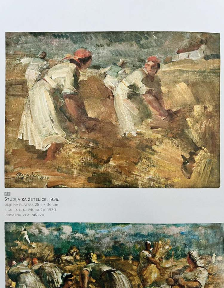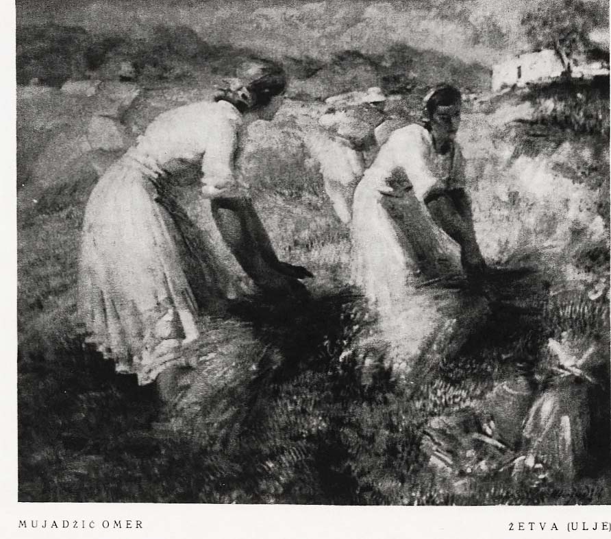 Hrvatski slikar Omer Mujadžić (Bosanska Gradiška, 1903. - Zagreb, 1991.) započinje svoju karijeru s tek petnaest godina kao najmlađi ikad upisani student na zagrebačku Akademiju likovnih umjetnosti. Diplomira 1924. godine u klasi Ljube Babića, a zatim odlazi u Pariz gdje se kao stipendist francuske vlade usavršava na Académie des Arts Décoratifs, École des Beaux Arts i u Louvreu. Na njegov pariški stilski razvoj utjecala su kanonska djela starih majstora koja je tamo imao priliku vidjeti, ali nesumnjivo najveći učinak imalo je figurativno slikarstvo Pabla Picassa te postkubistička manira Andréa Lhotea. Krajem dvadesetih godina izlaže na Proljetnom salonu u Zagrebu s prvim velikim nastupom na domaćem terenu od trideset djela i studija, a zatim i na prvoj izložbi Udruženja umjetnika Zemlja kao jedan od osnivača i kratkotrajni član. Već kao profesor na zagrebačkoj akademiji godine 1933. održava svoju prvu samostalnu izložbu u Salonu Ulrich. Osim u slikarstvu, ističe se i kao talentirani crtač i ilustrator za znanstvene publikacije, naslovnice knjiga i novčanice. Mujadžić tijekom svog formativnog razdoblja u dvadesetim godinama isprva slika intimne portrete i autoportrete te monumentalne figure ispred stilizirane pozadine. Iako se poigrava s postkubizmom, istovremeno iskazuje i sposobnost u izvedbi konvencionalnih reprezentaitvnih portreta. Erotični, čvrsto oblikovani i voluminozni ženski aktovi smješteni u kubizirani prostor tipični su za Mujadžićevo slikatstvo u prvim desetljećima karijere kada je još uvijek pod snažnim utjecajem svog pariškog obrazovanja. Tijekom kratkotrajnog djelovanja u okviru Zemljaša, on se okreće angažiranoj umjetnosti te prikazuje seljake i radnike, međutim ove motive vrlo brzo odbacuje za idealizirane prizore života na selu sa ženskim likovima, interijere i aktove. Tijekom tridesetih mu se godina potez oslobađa te počinje primjenjivati intenzivnije boje i svjetlosne naglaske, udaljavajući se od kubističke stilizacije. Tijekom Drugog svjetskog rata njegovo se stvaralaštvo naglo mijenja - vedru paletu zamjenjuje neutralnijom, a počnje slikati i prizore traumatičnih ratnih događaja. U srednjoj i starijoj dobi istražuje profinjene tonske skale u svojim gotovo monokromatskim prizorima intimističkih motiva. Ovdje predstavljena potpisana i datirana slika Žetva nastaje 1939. godine, za vrijeme Mujadžićeve faze intenzivnog kolorita. Kompozicijom slike dominiraju dva krupna ženska lika koji izranjaju iz žutog polja pšenice. Djelo je izvedeno širokim potezima kistom, a oblici su građeni isključivo koloristički. Harmonija je postignuta ponavljajućim naglascima boje: osim nijansama žute na polju i plavetnila neba, figure i kućica u pozadini riješeni su sumarnim potezima bijelom, smeđom i crvenom bojom. Jedno vrlo slično Mujadžićevo ulje na platnu većih dimenzija s istim naslovom izloženo je 1940. godine na Prvoj godišnjoj izložbi hrvatskih umjetnika u Domu likovnih umjetnosti kralja Petra I. Velikoga Oslobodioca (danas poznatom kao Dom HDLU) u Zagrebu u organizaciji Hrvatskog društva umjetnosti. Ta se veća verzija iste kompozicije, vjerojatno također nastala oko 1939. godine, ipak razlikuje od ovdje predstavljene slike po nekim svojim likovnim odlikama. Za razliku od manje verzije Žetve, na kojoj je kompozicija građena pastoznim nanosima čistih boja, na velikom se platnu Mujadžić odlučuje za deskriptivniji i zaglađeniji tretman površina te tonski izražen plasiticitet figura.
